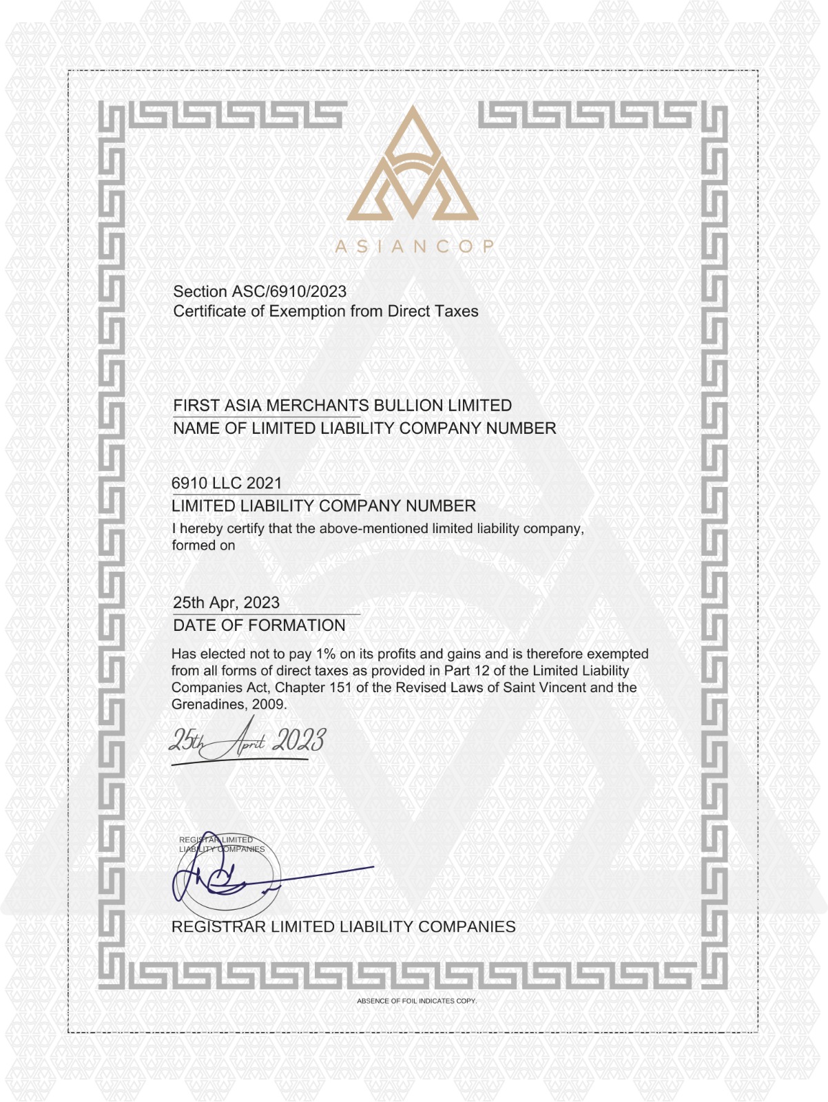 First Asia Merchants Bullion Limited ("First Gold"), previously known as Weal & Well Bullion, was established in Hong Kong in 1991. First Gold, a bullion group member of The Hong Kong Gold Exchange (HKGX), with the membership number 114 (Type AA License), an authorised Good Delivery Bars Minter, including 9999 One Kilo Gold and Five Taels Gold. In addition, First Gold is recognized e-trading member, specializing in Renminbi Kilobar Gold, 99 Taels gold, spot gold and silver trading. It has been providing professional and reliable bullion trading services to its clients in the globe, accumulating a wealth of experience over the years.